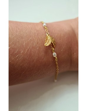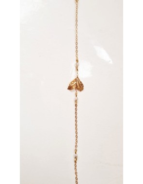 Deux niveaux d'attaches possibles pour le bracelet. Une petite feuille laisse la place à 2 petites chaines terminées par deux fines perles crème, en verre.
