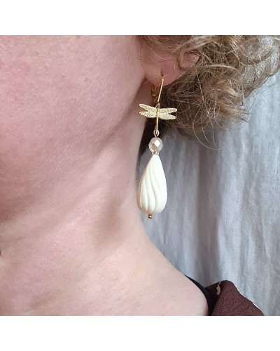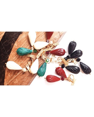 J'ai créé une boucle à partir d'un élément Art Nouveau, en ajoutant la géométrie simple d'une poire noire en résine, travaillée tout le long de la perle, comme on pouvait en voir souvent en 1925.