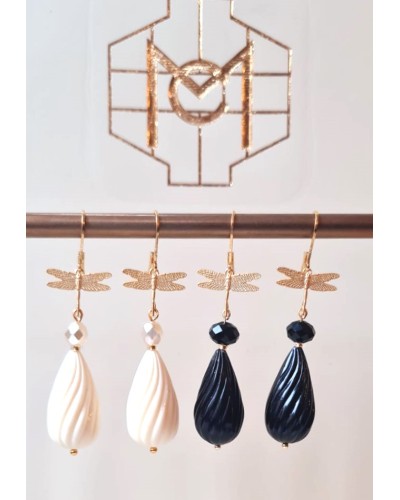 J'ai créé une boucle à partir d'un élément Art Nouveau, en ajoutant la géométrie simple d'une poire noire en résine, travaillée tout le long de la perle, comme on pouvait en voir souvent en 1925.
