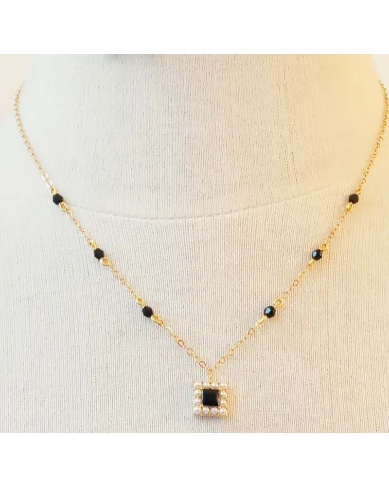 - Des perles en Crystal au long de la Chaine Goldfilled 14K, avec en finition un Carré entourés de perles fantaisie.