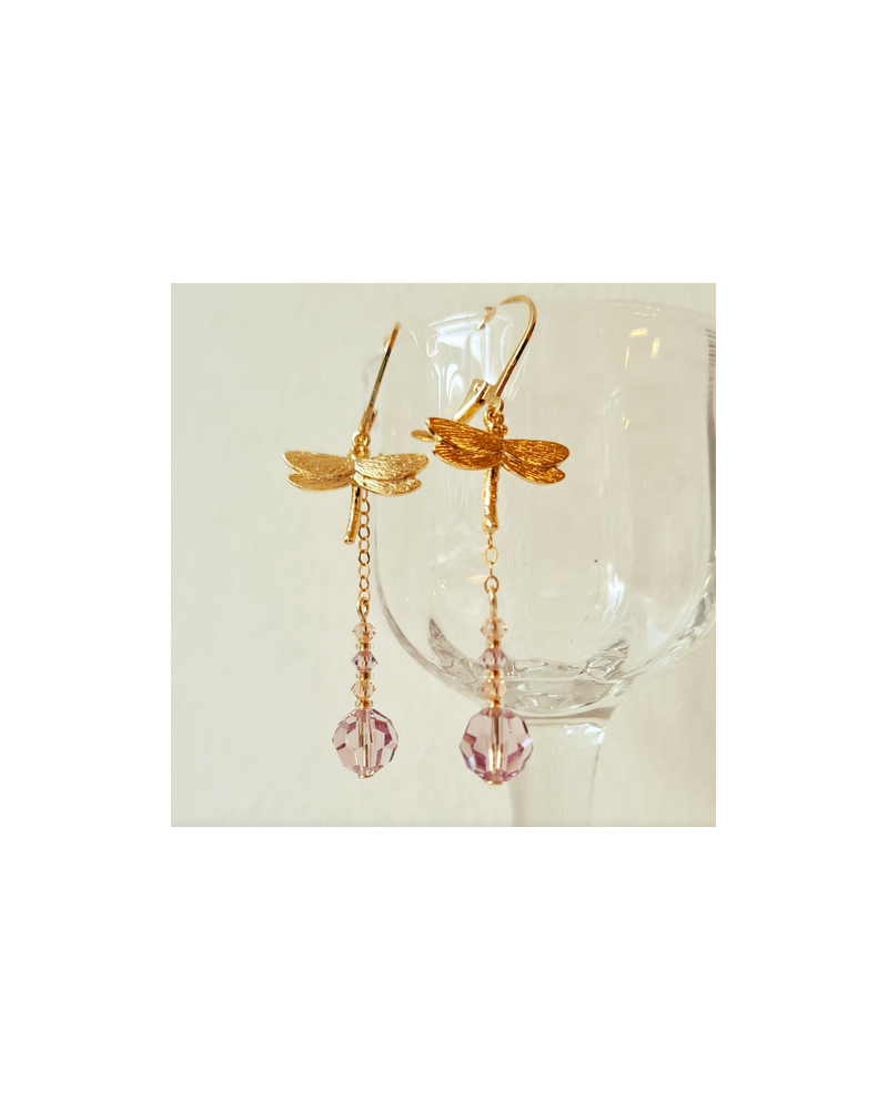 Queue de Libellule en Goldfilled 14K et perles en Crystal rose très pâle, reflets lila.